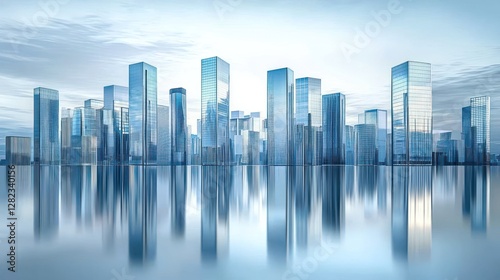 Fototapeta premium Modern city skyline reflected in calm water.
