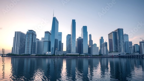 © Active Abdur Rouf, Obraz premium Modern city skyline reflected in calm water at dawn
