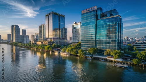 Obraz premium Modern City Skyline Reflected in Water at Dusk