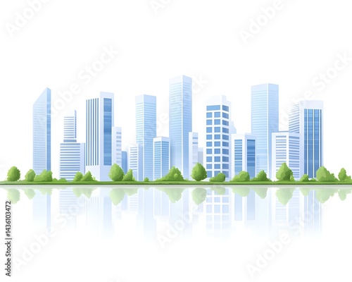 Obraz premium Modern city skyline reflected in water, with green spaces at the base