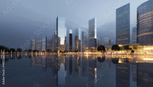 © jannatulmawoa, Obraz premium Modern City Skyline Reflecting in Calm Water at Dusk