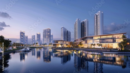 © Alleuy, Obraz premium Modern city skyline reflecting on calm water