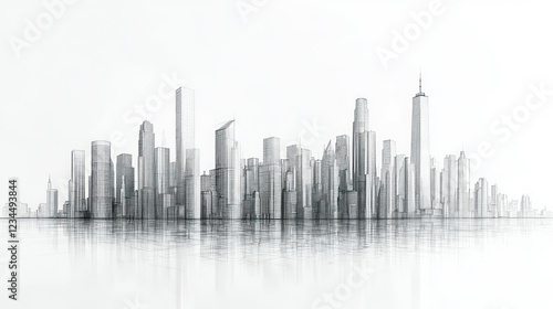© mlangsen, Fototapeta premium Modern city skyline reflecting on water, white background, architectural render