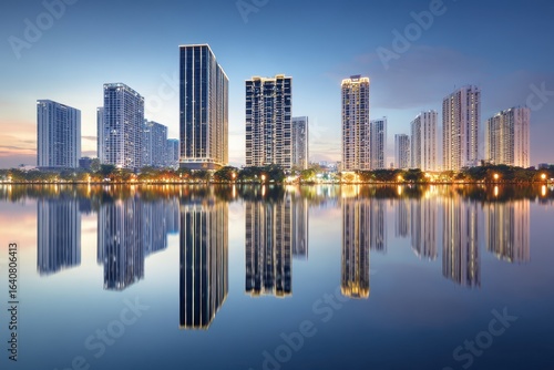 Fototapeta premium Modern City Skyline Reflection at Dusk with Water at the Foreground