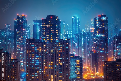 Obraz premium Modern city skyline showing dense buildings with glowing windows at night