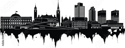 Obraz premium Modern city skyline silhouette illustration, urban architecture skyline artwork, contemporary cityscape design, business buildings horizon graphic for branding projects