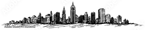 © Katarzyna, Naklejka premium Modern City Skyline Silhouette Panorama black shape vector laser cutting engraving monochrome print