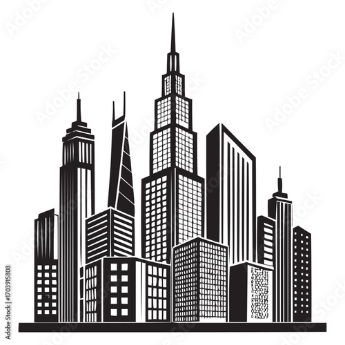 © Graphix Glider, Obraz premium Modern City Skyline Vector Illustration | Black and White Skyscraper Silhouette