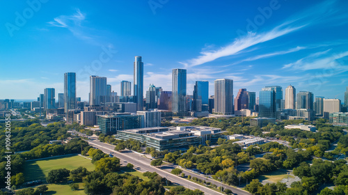 © song, Obraz premium Modern City Skyline with CBD Office Buildings at Sunset - Drone View