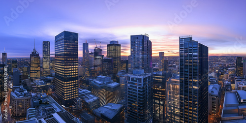 Obraz premium Modern City Skyline with CBD Office Buildings at Sunset, Drone View