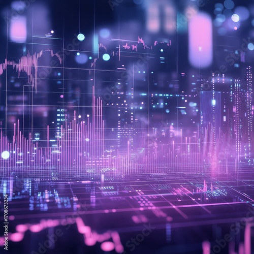© olegganko, Obraz premium Modern City Skyline With Colorful Digital Data Visualization at Night.