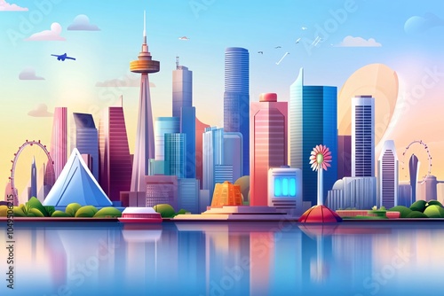 © Somsak, Fototapeta premium Modern City Skyline with Ferris Wheel and Reflection.