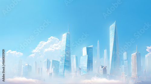 © z, Naklejka premium Modern City Skyline with Misty Atmosphere and Sunlit Reflections