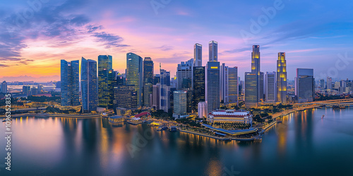 © song, Obraz premium Modern City Skyline with Office Buildings and Drone View at Sunset