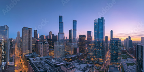 Obraz premium Modern City Skyline with Office Buildings and Drone View at Sunset