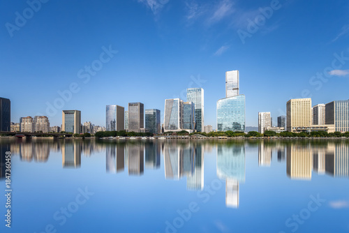 © zhouyilu, Fototapeta premium Modern City Skyline with Reflection in Calm Water