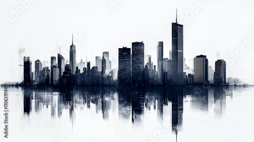 © Atmospheric stock, Fototapeta premium Modern city skyline with reflective water in monochrome