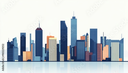 © Yotwarit, Fototapeta premium Modern city skyline with tall buildings and reflections on water. isolated on white background. flat design style.
