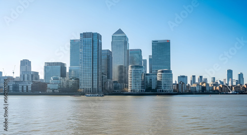 © Deny, Naklejka premium Modern City Skyline with Tall Glass Buildings Reflecting Sunlight Over Calm Water