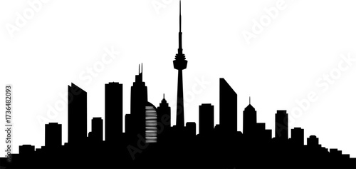 © Salma, Fototapeta premium Modern city skyline with three tall skyscrapers and a curved base silhouette isolated on white background