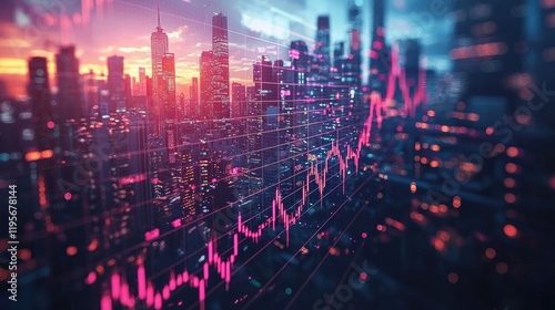 © pimpat, Naklejka premium Modern City Skyline with Trading Graph Overlay at Dusk
