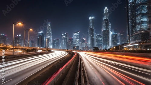 © Eren, Fototapeta premium Modern city skyline with traffic light trails at night long exposure