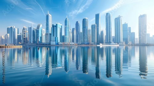 Fototapeta premium Modern city skyscrapers reflecting in water on a clear day, realistic urban landscape photo