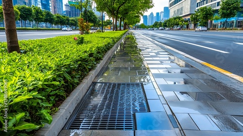 © terat, Fototapeta premium Modern City Street, Wet Pavement, Green Landscaping - Urban Landscapes