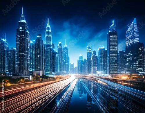 © Daily Beaters Studio, Fototapeta premium Modern city with city scape concept. Wireless network and Connection technology concept with city background at night. Nighttime view of a technologically advanced city.