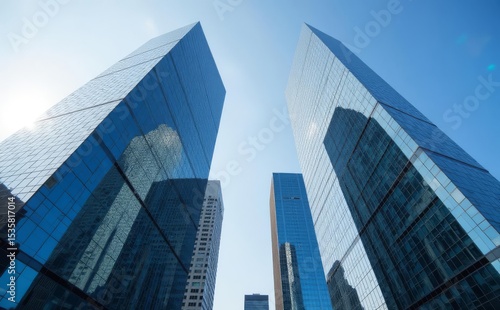© Jazzy E, Fototapeta premium Modern City With Long skyscraper sunlight from sky