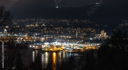 Fototapeta premium Modern Cityscape at Night with buildings and mountain in background. Taken from Capitol Hill in Burnaby, Vancouver, British Columbia, Canada.