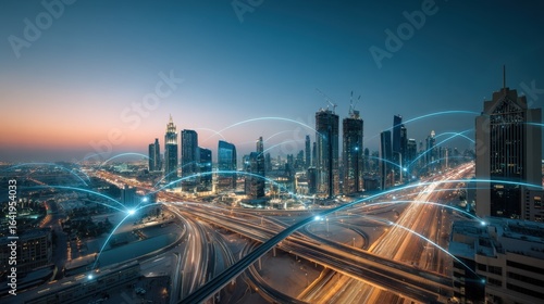 Fototapeta premium Modern Cityscape at Night with Interconnected Network, Representing Global...