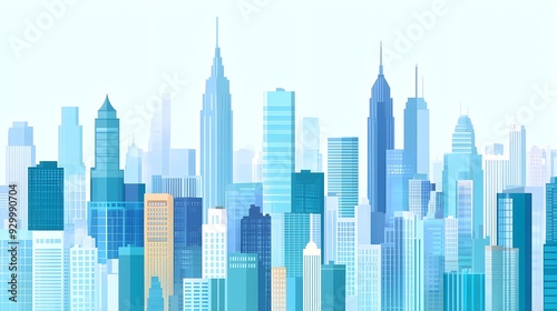 © Phichaphat, Naklejka premium Modern Cityscape Illustration, Blue Skyscrapers, Urban Design