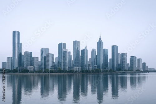 Fototapeta premium Modern Cityscape Reflection in Water: A Serene Urban Skyline with...