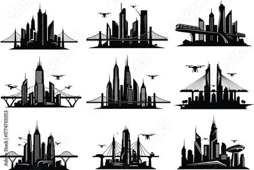 © Saiful Islam, Fototapeta premium Modern cityscape silhouettes with drones, urban skyline vector set, black clipart, futuristic architecture, smart city design, tech icons