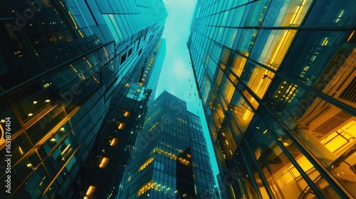 Fototapeta premium Modern cityscape view, gleaming glass structures reaching towards turquoise sky