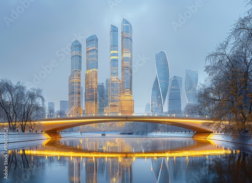 © Gustav, Fototapeta premium Modern Cityscape with Bridge and River in Winter