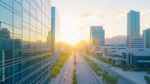 © Panupan, Fototapeta premium Modern Cityscape with Glass Buildings and Sunset Sky