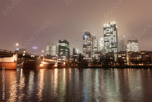 © virin, Fototapeta premium Modern cityscape with illuminated skyscrapers, bridge, and river at night