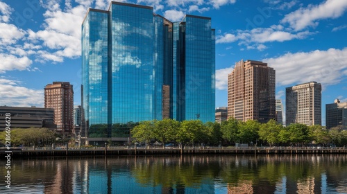 © Asraf, Naklejka premium Modern Cityscape with Reflected Buildings Beside Calm Water Under Bright Blue Sky