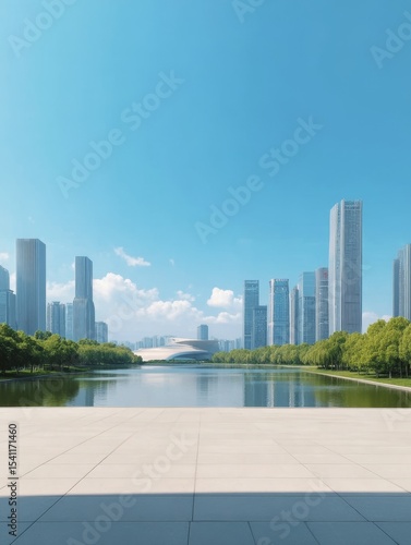 © xiangyanmeng, Fototapeta premium Modern Cityscape with Reflective Water and Greenery