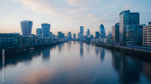 Naklejka premium Modern Cityscape With River Reflection At Sunset