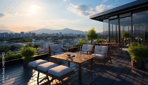 Fototapeta premium Modern cityscape with skyscrapers, sunset, and balcony overlooking the skyline generated by AI