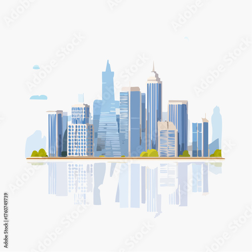 © Bakeke, Obraz premium Modern cityscape with tall buildings and reflection on white background