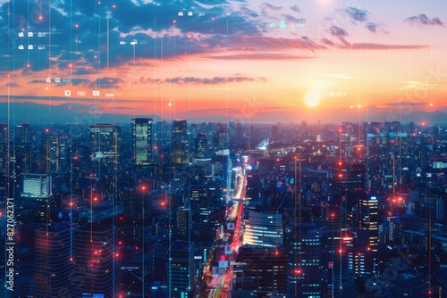 Fototapeta premium Modern cityscape with towering skyscrapers. busy road and urban infrastructure This urban landscape overlay consists of dynamic data streams and digital data.