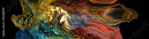 © sdmix, Fototapeta premium Modern colorful flow background on black. Wave Liquid shape in color banner.