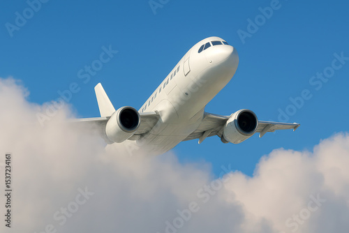 © EKH-Pictures, Obraz premium Modern commercial airliner breaks through the clouds during takeoff into the blue sky