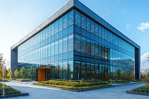 Obraz premium Modern commercial building with large glass windows and landscaping