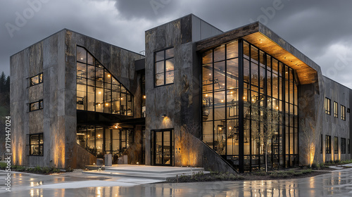 © KeJayStudio, Obraz premium Modern commercial building with large glass windows and metal siding under cloudy sky, warm interior lighting creating inviting atmosphere at dusk