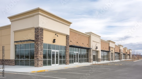 Obraz premium Modern Commercial Strip Mall Facade with Empty Storefronts and Parking Lot on...